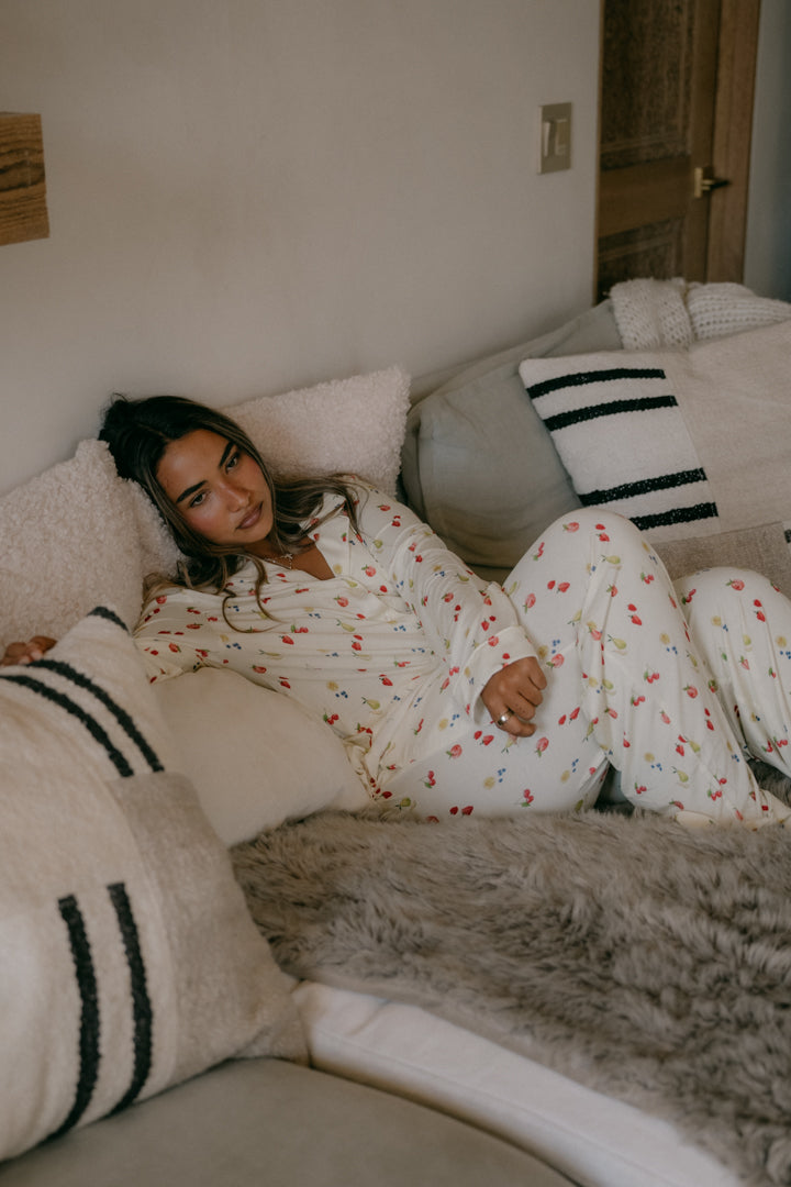 our most-loved organic bamboo lounge sets return in timeless stripes and sweet bows - soft, breathable, and back in limited quantities.